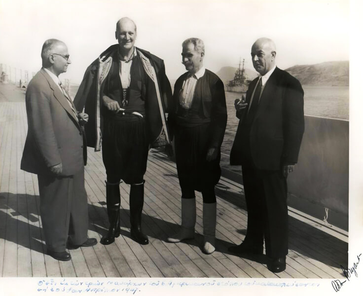 A US Admiral in Cretan costume on the deck of a warship of the 6th Fleet. On his right is Christos Aetou Tzifakis. Suda, April 1947. Christos A. Tzifakis Family Photo Archive.