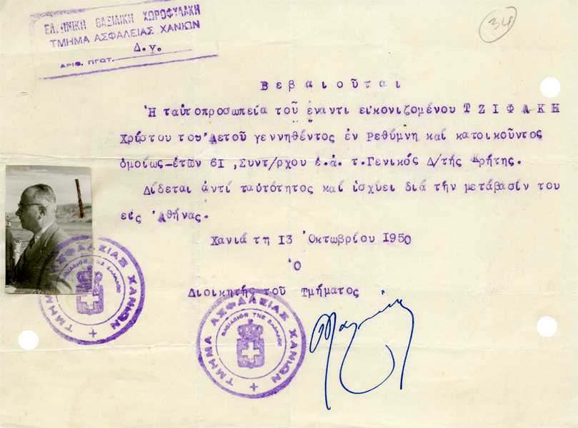 Certificate issued by the Chania Security Police, certifying the identity of Ch. A Tzifakis (13 October 1950).