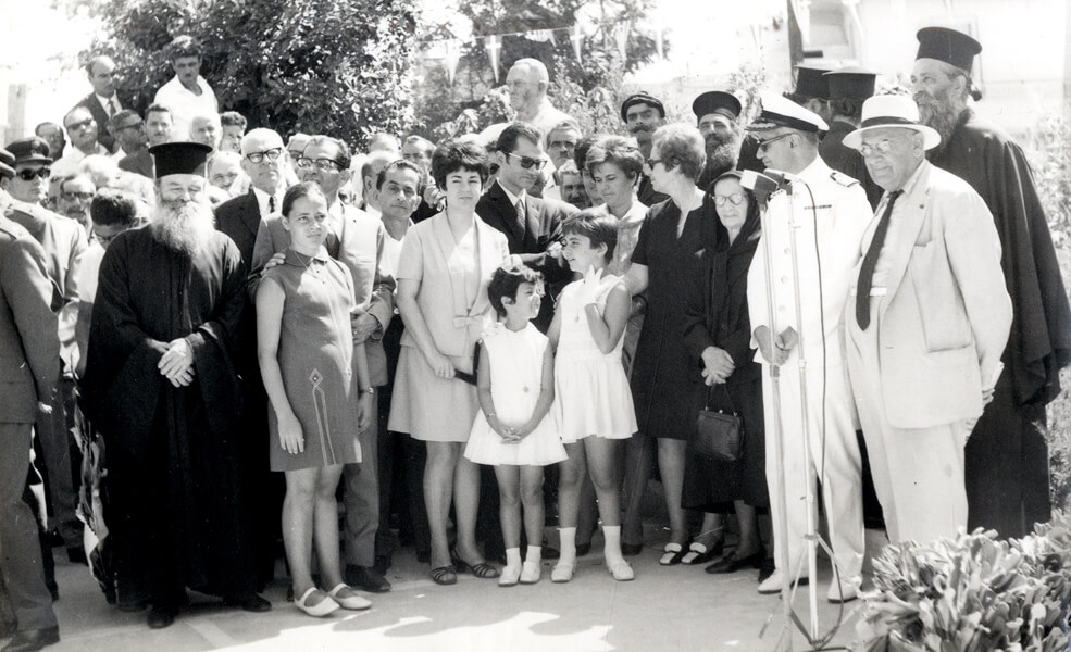 Unveiling of the bust of Ch. A Tzifakis in front of the Rethymno Prefecture building, 24 August 1969. Second from the right is Aetos Tzifakis, Christos's son, in uniform, with, to his left, Christos's sister Chryssanthi, his wife Fofo and his granddaughter Margarita. In the centre is Eleni, Christos's daughter-in-law, and in the second row behind her is Nikos, his younger son, wearing sunglasses.