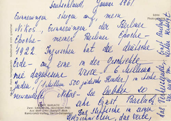 Οι αναμνήσεις ξανάρχονται, Νίκο μου... Αναμνήσεις της εποχής του Βερολίνου, της Βερολινέζικης εποχής μου, του 1922. Στο μεταξύ, η γερμανική γη, μ' ένα τρόπο που δεν ξανάγινε στην Ιστορία, μεταμόρφωσε σε στάχτη 6 εκατομμύρια Εβραίων (ενάμισυ εκατομμύριο παιδιών).