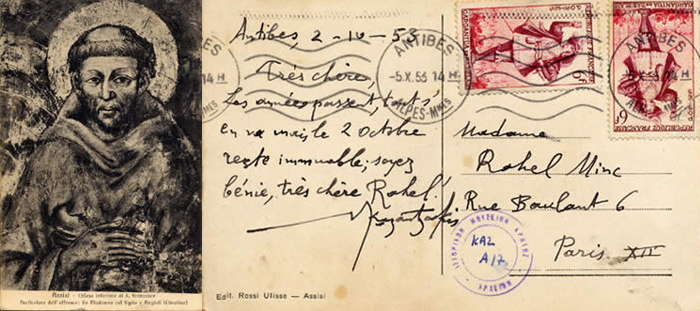 Έχοντας επιστρέψει στην Antibes, ο Kαζαντζάκης συμβουλεύει τον Jules Dassin σχετικά με το σενάριο μιας κινηματογραφικής διασκευής του "O Xριστός Ξανασταυρώνεται".